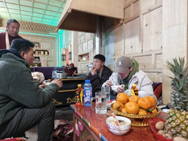 当时正值藏历新年,泽仁一家热情邀请项目组参加当地的庆典仪式,这一天热闹非凡,泽仁却独自一人跑到了屋顶。